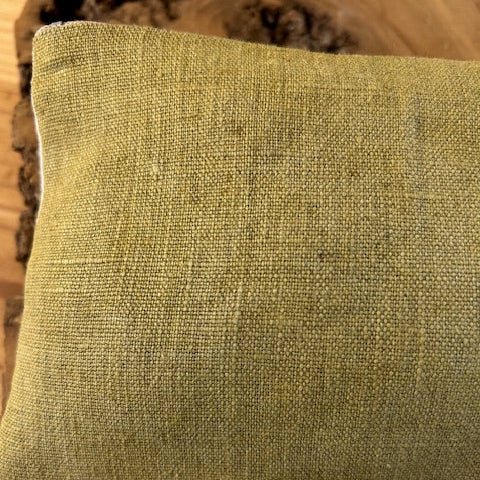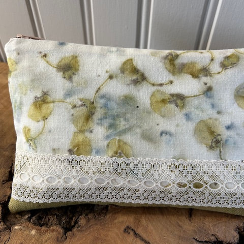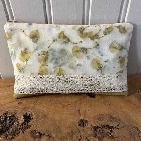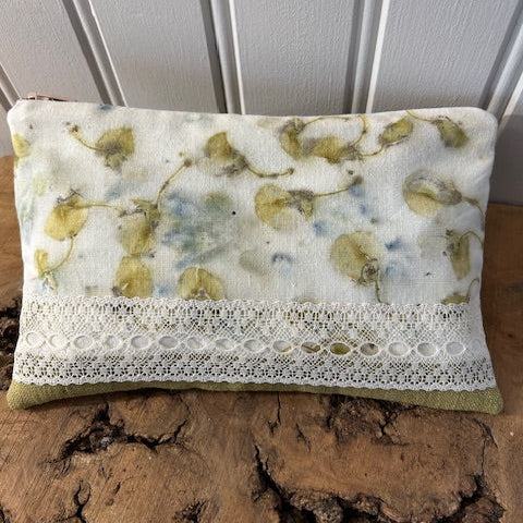 Pochette réalisée à partir de draps anciens avec des impressions végétales de fleurs de glycine et lin teinté à l'artichaut.