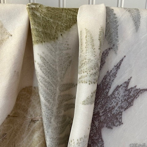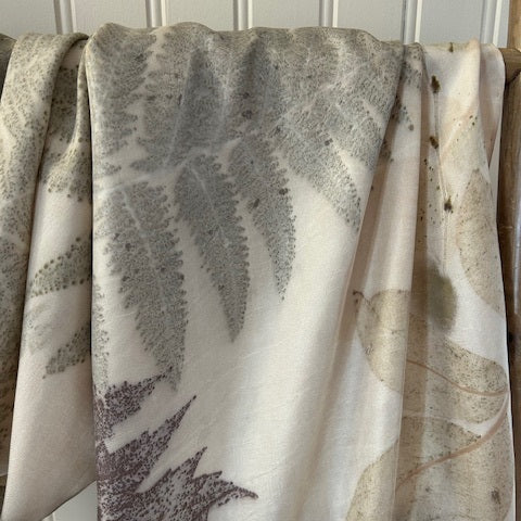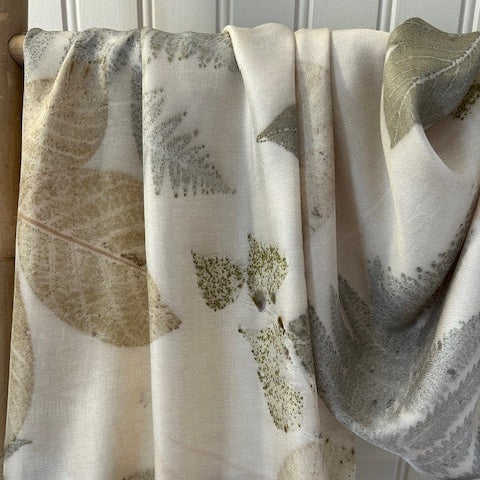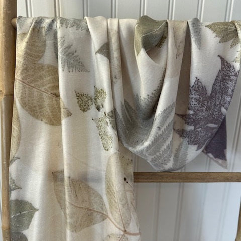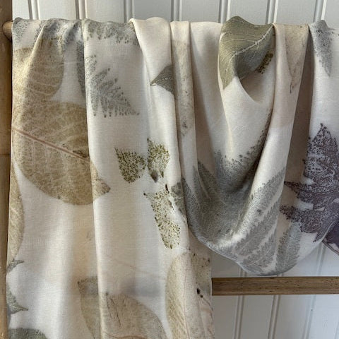 Foulard en twill de soie naturelle avec des impressions végétales et fond en couleur naturelle légère de noyer.
