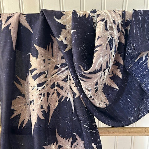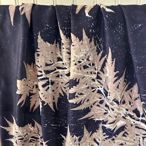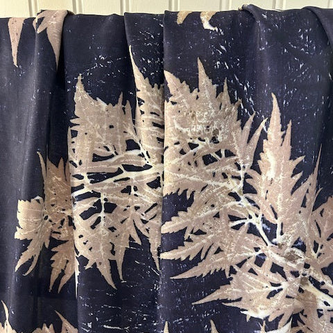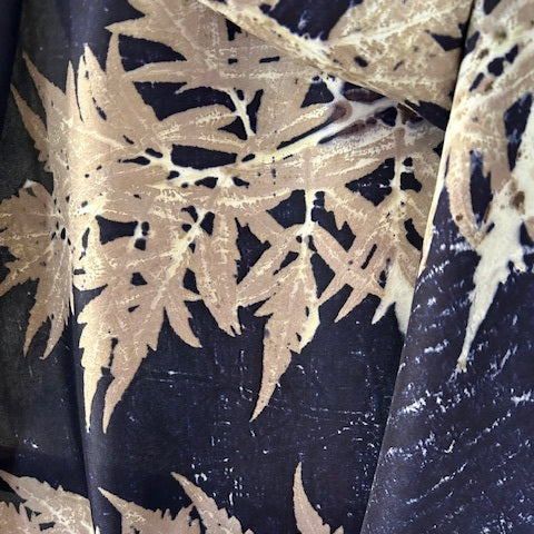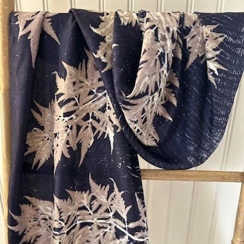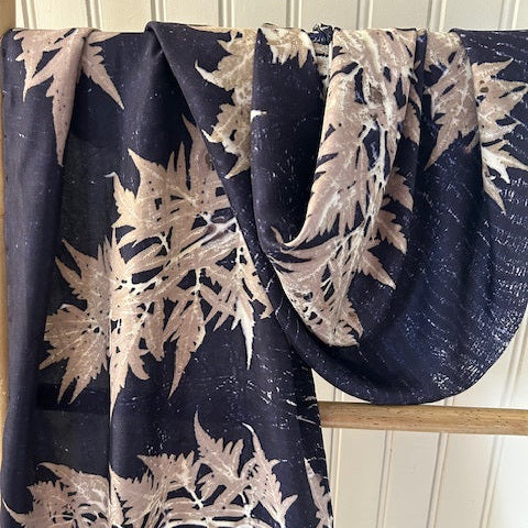 Foulard en twill de soie naturelle avec des impressions végétales de sumac sur fond en couleur naturelle de bois de campêche.