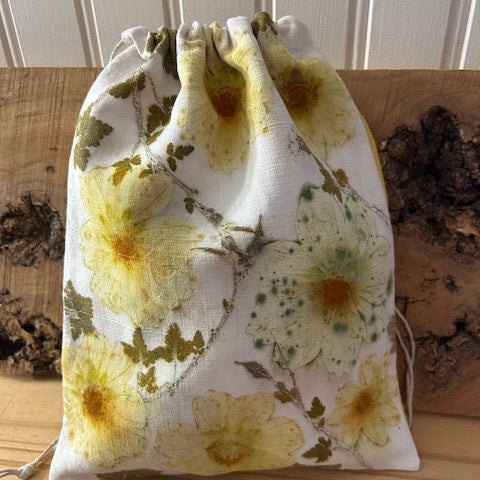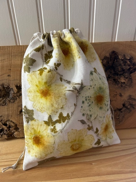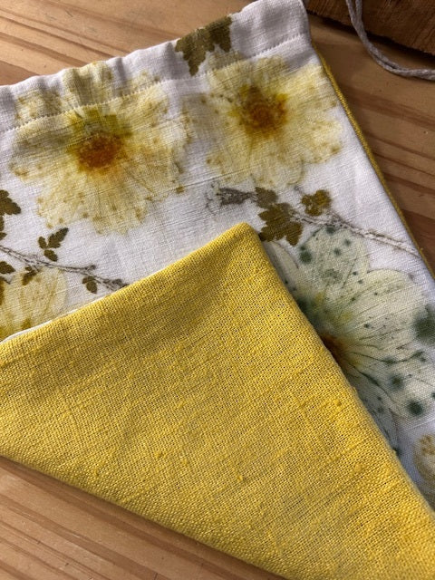 Pochette réalisée à partir de draps anciens avec des impressions végétales fleurs de cosmos.